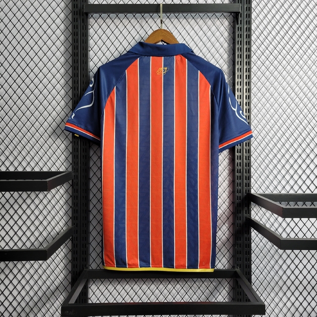 A nova camisa reserva do Bahia traz o tradicional design tricolor, com faixas verticais em azul escuro e vermelho, separadas por finas linhas brancas.