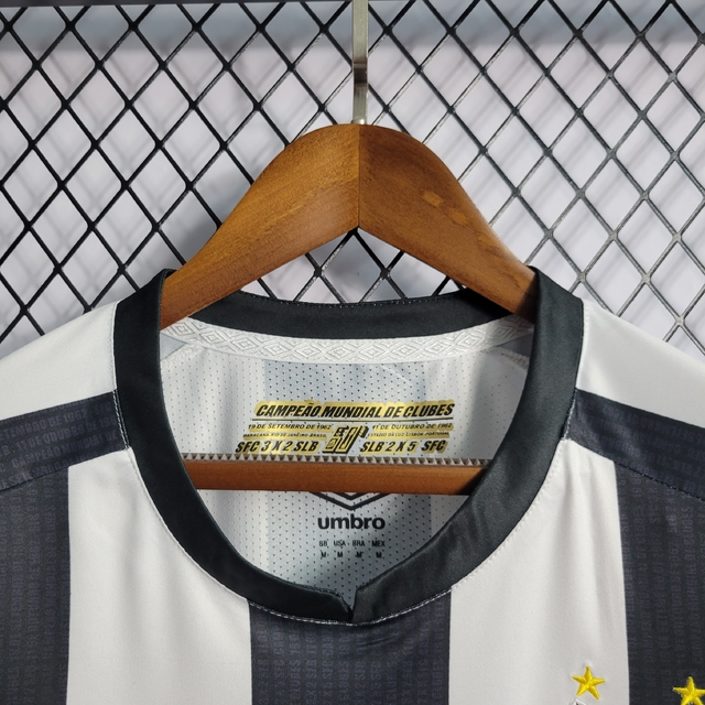 A Camisa reserva do Santos para 2022 celebra os 60 anos do primeiro título Mundial do Santos Futebol Clube, trazendo uma homenagem aos craques que venceram os portugueses do Benfica por 5 a 2 na final em Lisboa. O novo manto vem com o famoso listrado em preto e branco, apresentando um detalhe especial nas listras pretas com a inscrição da data, local e placar das partidas finais.