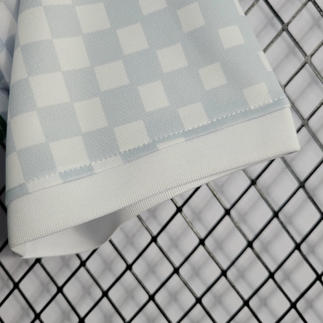 O manto alternativo do Sporting traz o branco como predominante, com um padrão quadriculado em escala pequena, na cor cinza. As costas ganham um box branco liso, mesma cor da gola V e dos punhos, enquanto as faixas laterais são verdes.